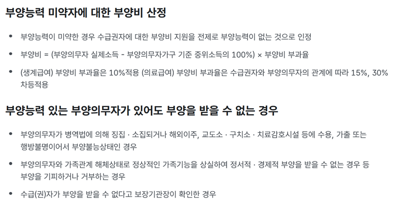 6. 부양 능력이 미약한 경우에는 실제 소득에서 가구 기준 중위소득의 100%를 뺀 금액에 부양비 부과율을 곱하여 부양비가 산정됩니다. 한편, 부양의무자가 군 복무, 수감, 해외 이주 등으로 부양이 불가능한 상태이거나, 가족 관계 해체 등으로 정서적·경제적 부양을 기피하는 경우에도 부양을 받을 수 없는 경우로 인정될 수 있습니다.