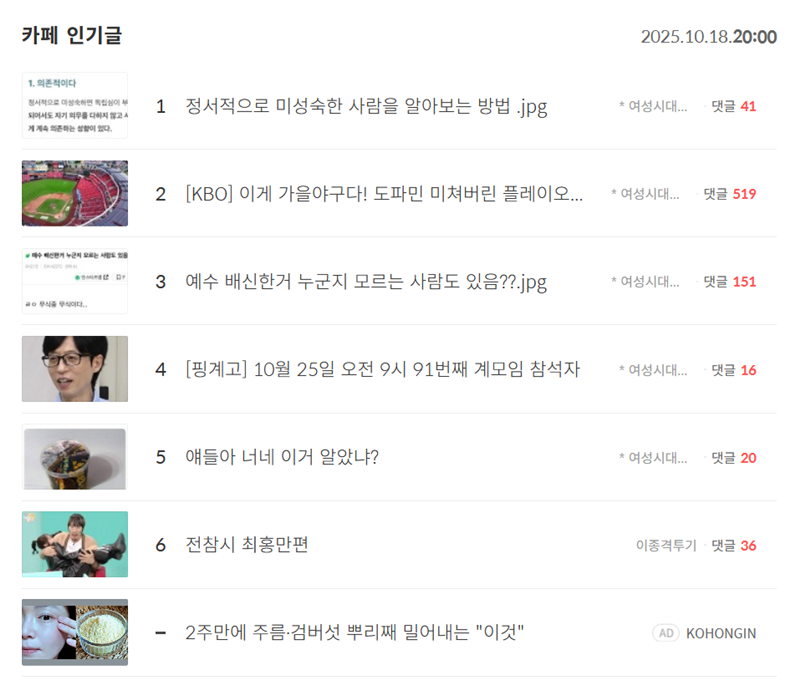 다양한 커뮤니티에서 지금 가장 주목받는 이야기들을 실시간으로 모아 보여주는 서비스입니다. 여러 카페에 흩어져 있는 인기 게시물들을 한곳에서 순위별로 쉽게 확인할 수 있어 편리합니다. 다음카페 인기글 실시간은 Daum 카페 홈페이지에서 이용할 수 있습니다.