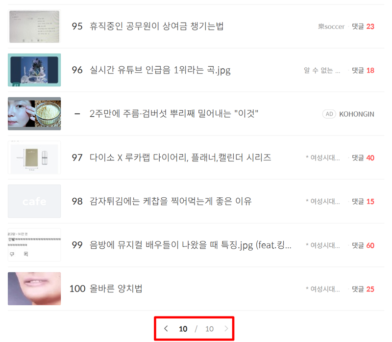 3. 인기글 목록은 여러 페이지에 걸쳐 제공되어 더 많은 게시물을 살펴볼 수 있습니다. 화면 하단의 페이지 번호를 통해 다른 페이지로 이동하며 다양한 커뮤니티의 화제 글들을 놓치지 않고 확인할 수 있습니다.