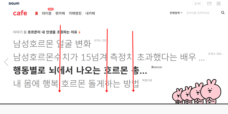 1. 메인 화면에서는 '이야기 뇌', '호르몬' 등 현재 주목받는 키워드와 함께 다양한 주제의 글들을 볼 수 있습니다. 이용자들의 관심사를 반영한 여러 글들이 올라와 있어 어떤 이야기들이 활발히 논의되고 있는지 한눈에 파악할 수 있습니다.