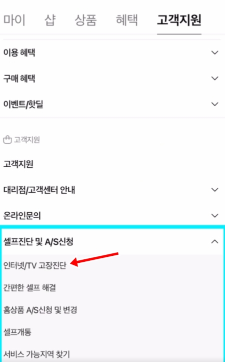 4. 고객지원 메뉴 안에서 '셀프진단 및 A/S신청' 항목을 찾아주세요. 그 아래에 있는 '인터넷/TV 고장진단'을 선택하면, 본격적으로 현재 이용 중인 서비스의 상태를 점검하는 과정을 시작할 수 있습니다.