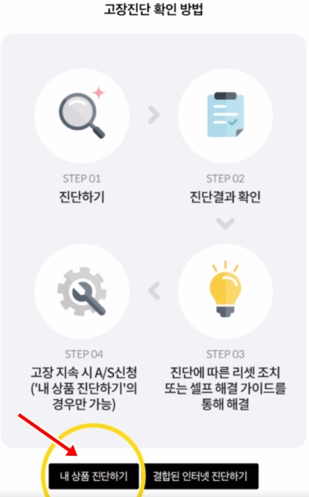 5. 고장진단은 진단하기, 진단결과 확인, 리셋 또는 셀프 해결, 그리고 A/S 신청의 순서로 진행됩니다. 내용을 확인한 후, 화면 아래에 있는 '내 상품 진단하기'를 눌러서 바로 점검을 시작해 보세요.