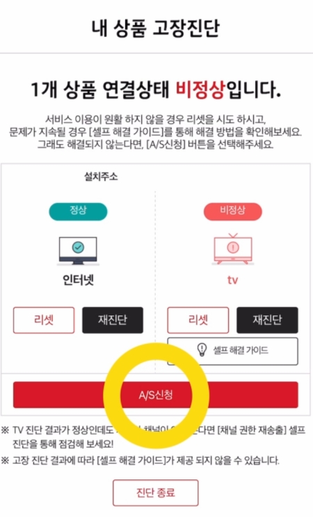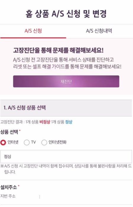 10. A/S 신청 화면으로 넘어가면, 고장진단 결과가 다시 한번 표시됩니다. 문제가 발생한 상품(인터넷, TV, 인터넷전화 중)을 선택하고, 방문 주소 등의 정보를 입력하여 접수를 완료하면 됩니다.