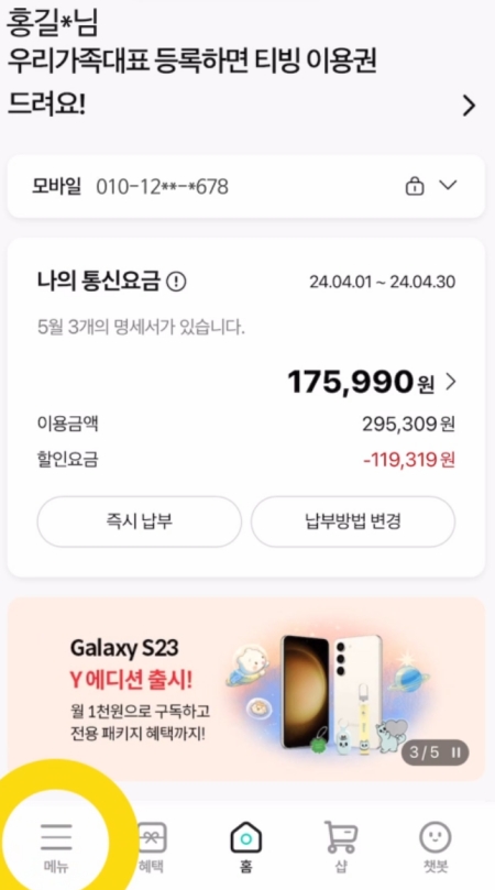 2. 마이케이티(My KT) 앱에 들어간 후, 화면 왼쪽 아래에 있는 '메뉴' 부분을 눌러 전체 메뉴를 열어주세요. 이곳에서 요금 조회뿐만 아니라 다양한 부가 기능들을 확인하고 신청할 수 있습니다.