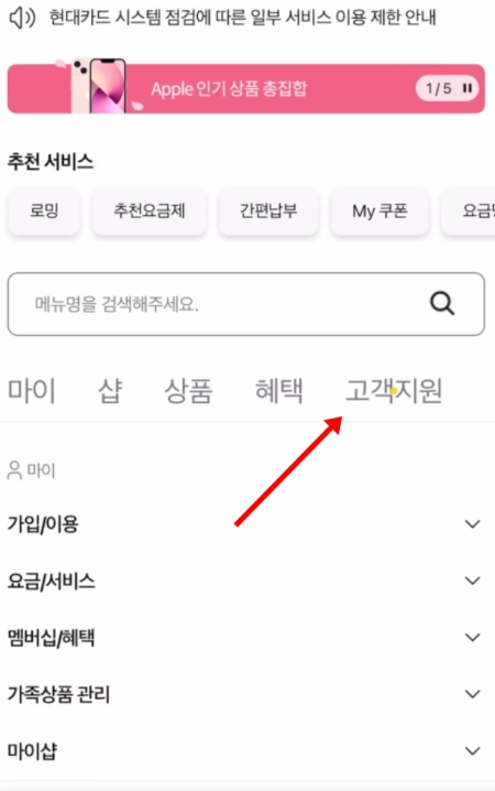 3. 전체 메뉴 화면이 나타나면 '마이', '샵', '상품', '혜택', '고객지원' 등 여러 항목을 볼 수 있습니다. 이 중에서 다섯 번째에 위치한 '고객지원'을 선택하여 다음 단계로 넘어가 주세요.