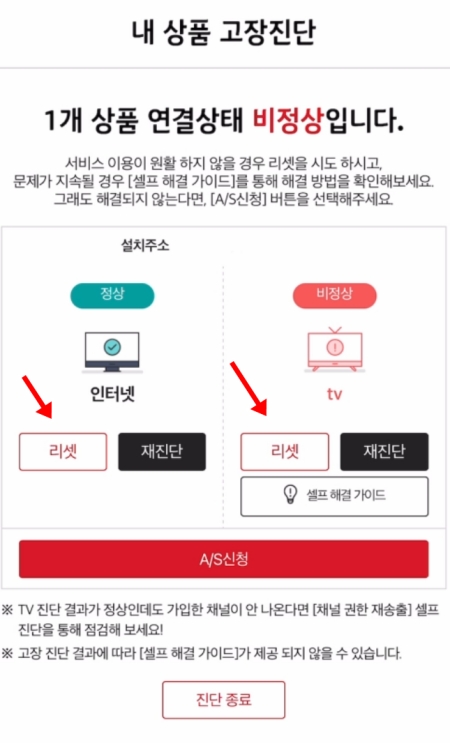 6. 진단 결과, 현재 1개 상품의 연결 상태가 비정상으로 확인되었습니다. 인터넷은 정상 상태이지만, TV 연결에 문제가 있는 것으로 나타났네요. 우선 각 항목 아래에 있는 '리셋'을 실행하여 서비스 재부팅을 시도해 볼 수 있습니다.