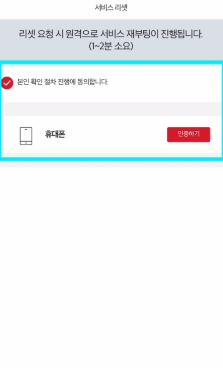 7. 서비스 리셋을 요청하면 원격으로 재부팅이 진행되며 약 1~2분 정도 소요될 수 있습니다. 진행에 앞서 본인 확인 절차가 필요하니, '본인 확인 절차 진행에 동의합니다'에 확인 표시를 하고 휴대폰 인증을 완료해주세요.