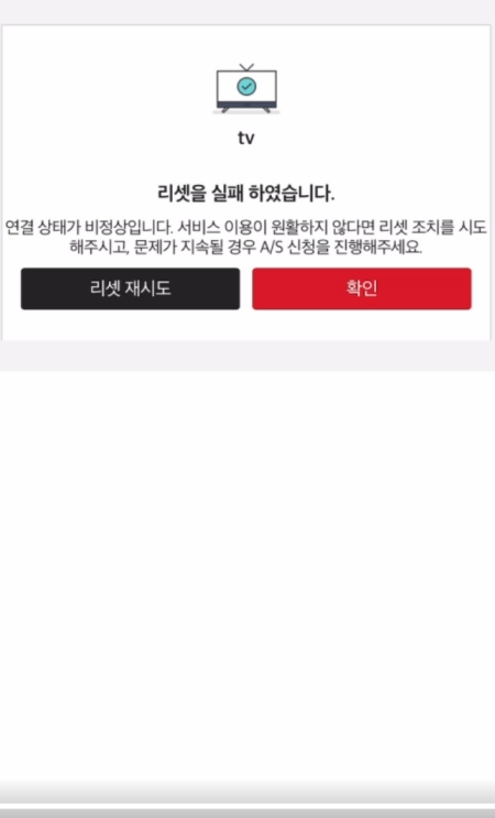 8. 안타깝게도 TV 리셋 시도에 실패했습니다. 연결 상태가 여전히 비정상이며, 서비스 이용이 원활하지 않을 수 있다는 안내가 나옵니다. '리셋 재시도'를 통해 다시 한번 시도하거나 '확인'을 눌러 다른 방법을 찾아볼 수 있습니다.
