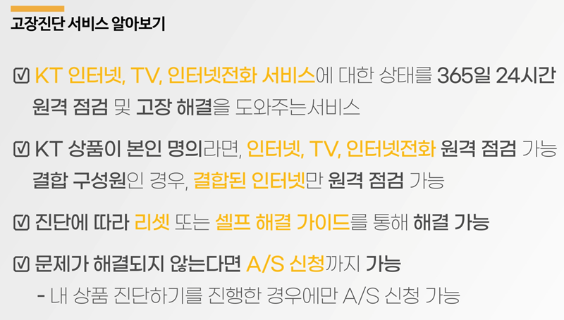 1. 고장진단 서비스는 KT의 인터넷, TV, 인터넷전화에 대한 상태를 365일 24시간 원격으로 점검하고 문제를 해결하는 데 도움을 줍니다. 본인 명의의 상품이라면 모두 원격 점검이 가능하며, 결합 구성원인 경우에는 결합된 인터넷만 점검할 수 있습니다. 진단 결과에 따라 리셋이나 셀프 해결 가이드를 통해 조치하고, 그래도 해결되지 않으면 A/S 신청까지 할 수 있습니다.