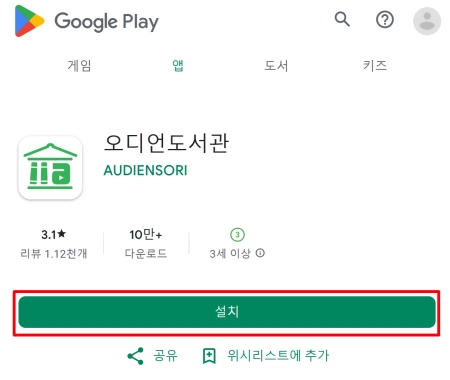 1. 구글 플레이스토어에서 '오디오도서관'을 찾아 설치를 진행합니다. 이 앱을 통해 여러 도서관의 오디오북을 한 곳에서 편리하게 만나볼 수 있습니다. 10만 회 이상 다운로드되었고, 많은 사람들이 이용하고 있는 것을 확인할 수 있습니다.