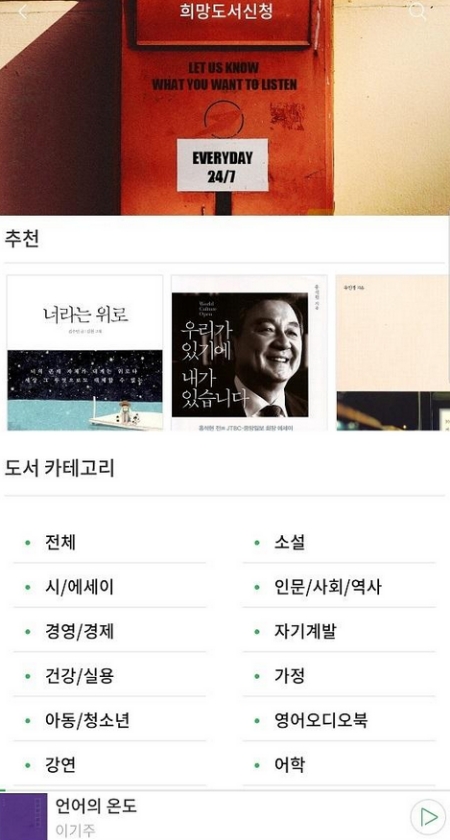 8. 듣고 싶은 책이 도서관에 없다면 '희망도서 신청' 기능을 활용해 보세요. 또한, '도서 카테고리'를 통해 시/에세이, 경영/경제, 어학 등 세분된 분야별로 책을 둘러볼 수 있어 새로운 책을 발견하는 재미도 느낄 수 있습니다.