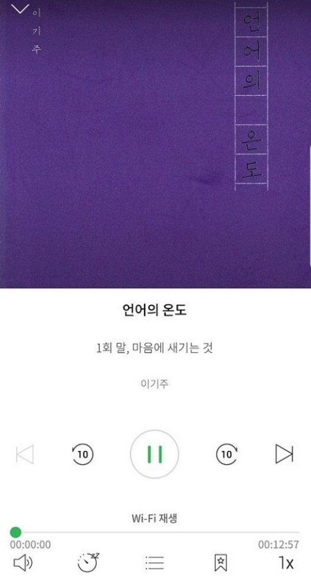 4. 마음에 드는 책을 고르면 바로 재생 화면으로 넘어갑니다. 여기서는 재생, 일시정지, 10초 앞뒤로 이동하기 등의 기본적인 조작이 가능합니다. 운전 중이거나 다른 일을 하면서도 편하게 책의 내용을 들을 수 있어 유용합니다.