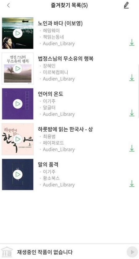 7. 자주 듣거나 나중에 다시 듣고 싶은 책은 '즐겨찾기 목록'에 추가해둘 수 있습니다. 마음에 드는 책들을 따로 모아 관리할 수 있어 편리하며, 필요할 때마다 목록에서 바로 찾아 다시 들을 수 있습니다.