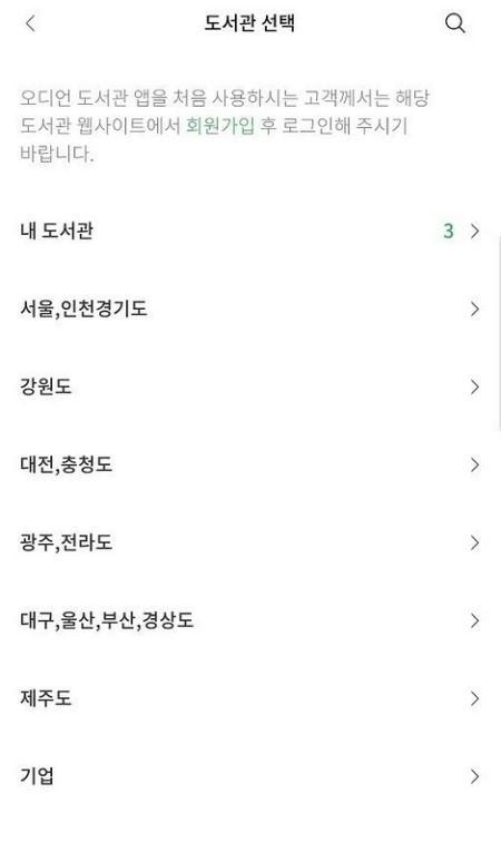 2. 앱을 처음 실행하면 이용할 도서관을 선택해야 합니다. 자신이 회원으로 가입된 지역 도서관을 찾아 목록에서 고르면 됩니다. 만약 아직 도서관 회원이 아니라면, 먼저 해당 도서관 홈페이지에서 회원가입을 마친 후에 로그인을 진행해야 합니다.