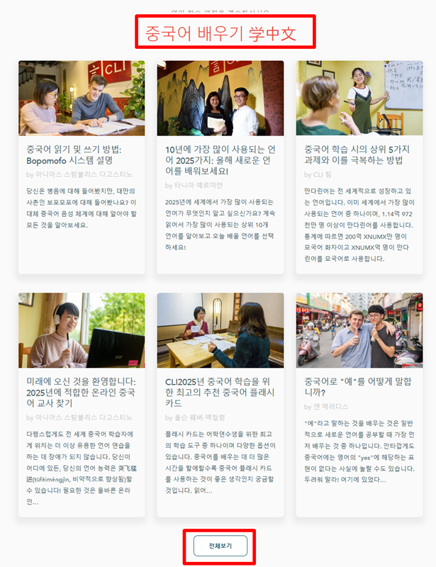 3. 자료실에는 다양한 주제의 글들이 있는데, 그중 '중국어 배우기' 부분을 살펴보세요. 이곳에는 중국어 읽기, 쓰기, 어휘 등 학습의 기초를 다질 수 있는 유익한 게시물들이 정리되어 있습니다. 하단의 '전체보기'를 누르면 더 많은 학습 자료를 한눈에 볼 수 있습니다.