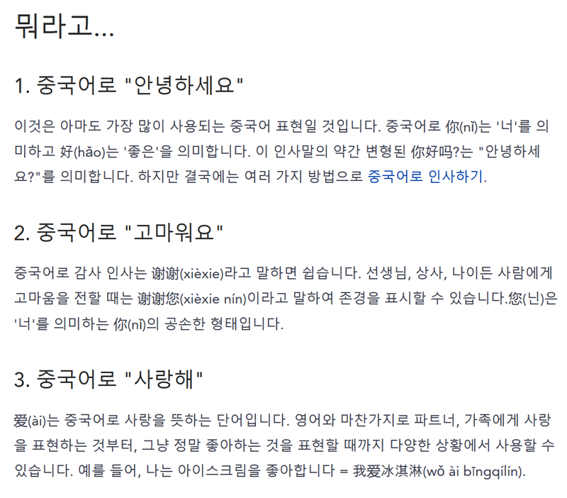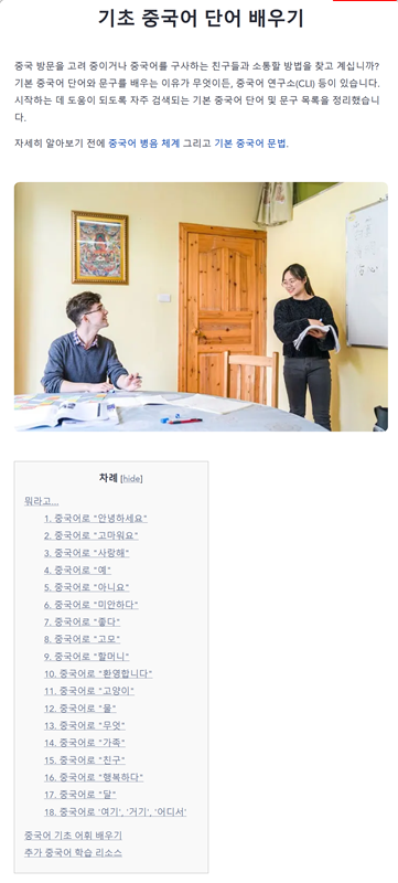 5. '기초 중국어 단어 배우기' 게시물을 열면 가장 먼저 목차가 나옵니다. 안녕하세요, 고마워요, 사랑해 등 일상에서 자주 쓰이는 표현들이 순서대로 정리되어 있어요. 배우고 싶은 부분을 먼저 확인하고 해당 내용으로 바로 이동하여 학습을 시작할 수 있습니다.