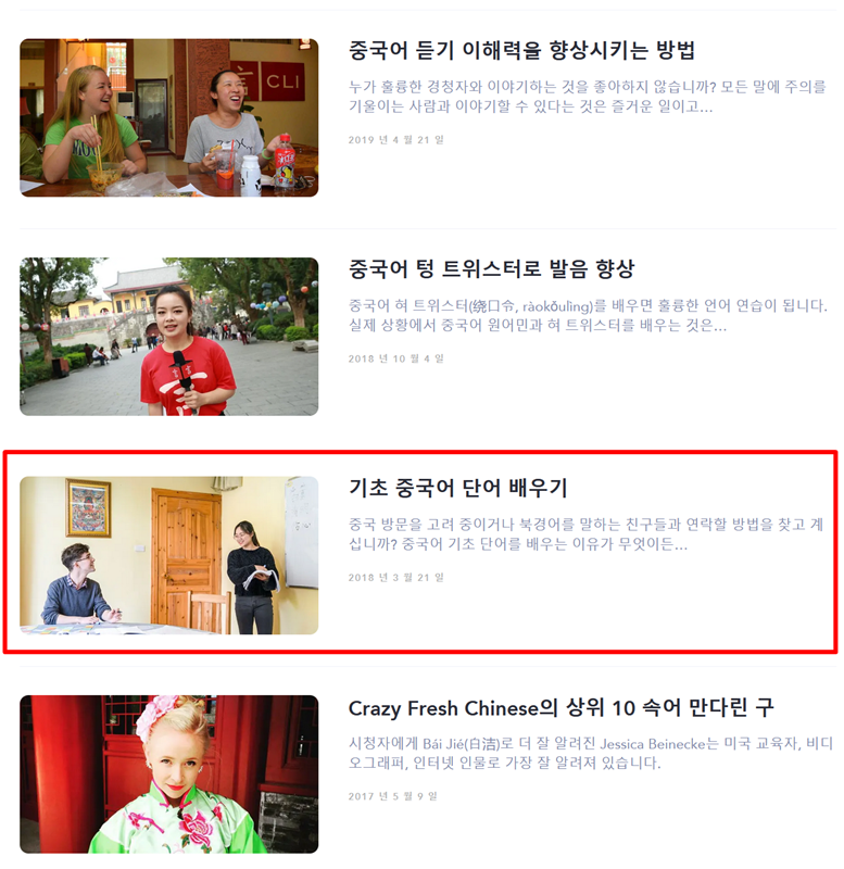 4. '중국어 배우기' 목록을 보면 여러 학습 글이 나옵니다. 여기서 '기초 중국어 단어 배우기'라는 제목의 게시물을 선택해 보세요. 처음 중국어를 접하는 사람들에게 꼭 필요한 기본적인 단어와 표현들이 잘 정리되어 있어 학습의 첫 단추를 꿰는 데 안성맞춤입니다.