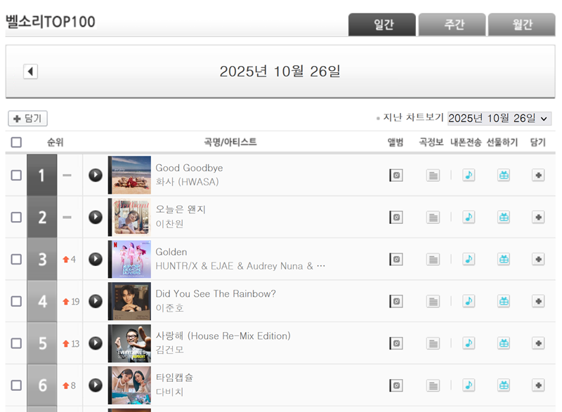 2. '벨소리 TOP100' 화면에서는 2025년 10월 26일 자의 최신 순위를 확인할 수 있습니다. 현재는 화사의 'Good Goodbye'라는 곡이 1위를 차지하고 있네요. 지난 날짜의 순위가 궁금하다면 날짜를 변경하여 찾아보는 것도 가능합니다.
