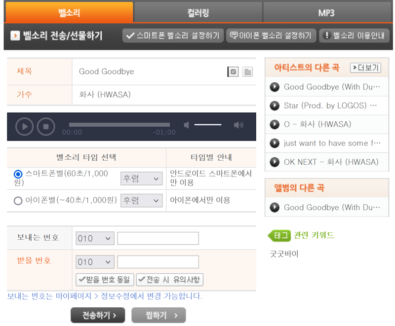 4. 마음에 드는 곡을 고르면 미리 들어볼 수 있는 상세 화면으로 이동합니다. 여기서는 스마트폰과 아이폰 중 기종에 맞는 파일 형식을 선택할 수 있고, 수신음을 받을 사람의 번호를 입력하여 보내는 과정이 이루어집니다.
