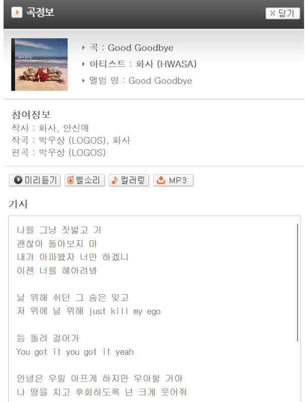 7. 곡 정보에서는 작사가, 작곡가, 편곡가 등 제작에 참여한 사람들의 이름과 전체 가사를 볼 수 있습니다. 가사를 미리 확인하고 벨소리로 지정하고 싶은 구간을 정하는 데 참고할 수 있습니다.