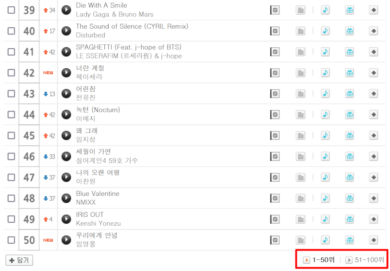 3. 화면을 아래로 내리면 더 많은 순위의 곡들을 확인할 수 있도록 페이지가 나뉘어 있습니다. '1-50위'뿐만 아니라 '51-100위' 부분을 통해 숨겨진 좋은 노래들을 발견하고 들어볼 수 있습니다.