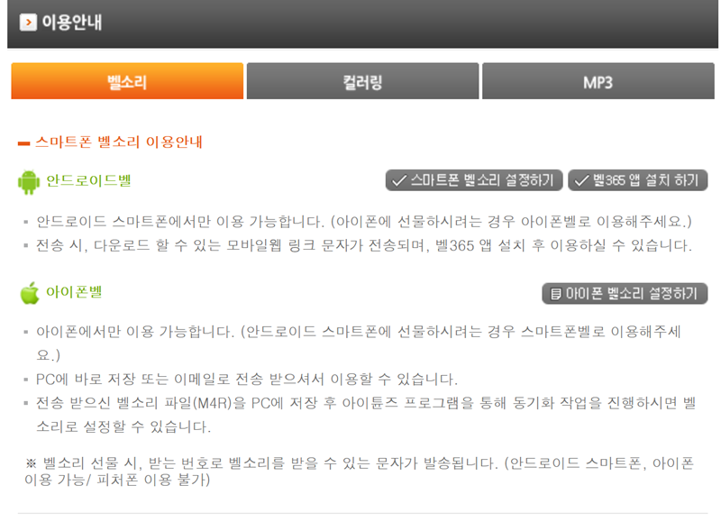 5. 이용 안내에서는 기종별 설정 방법을 자세히 설명하고 있습니다. 안드로이드폰은 전용 앱을 통해 비교적 간단하게 변경할 수 있고, 아이폰의 경우 PC로 파일을 옮긴 후 동기화하는 절차가 필요합니다.