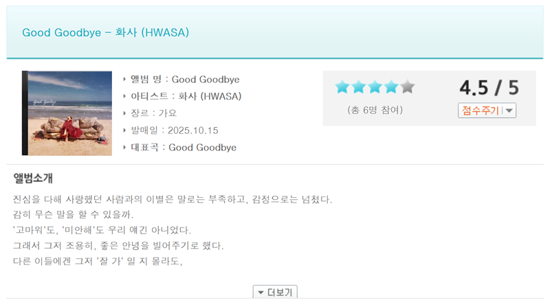 6. 앨범에 대한 구체적인 정보를 보고 싶다면 앨범 소개를 확인하면 됩니다. 예를 들어 화사의 'Good Goodbye' 앨범은 2025년 10월 15일에 발매되었고, 다른 이용자들의 평점도 볼 수 있어 선택에 도움이 됩니다.