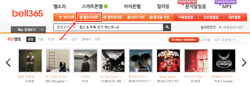 1. 홈페이지 상단에 있는 여러 메뉴 중에서 '벨소리차트'로 들어가면 현재 인기 있는 곡들의 순위를 모아서 볼 수 있습니다. 어떤 노래를 고를지 고민될 때 참고하기 좋으며, 원하는 곡을 찾았다면 목록에서 해당 곡을 선택해 주세요.