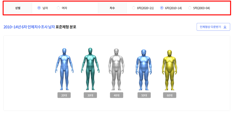4. 성별은 '남자'로, 차수는 '6차(2010~14)'로 설정해 주세요. 이렇게 하면 2010년부터 2014년까지 조사된 남성 인체치수 데이터를 기준으로 한 표준체형 분포를 연령대별로 확인할 수 있습니다.