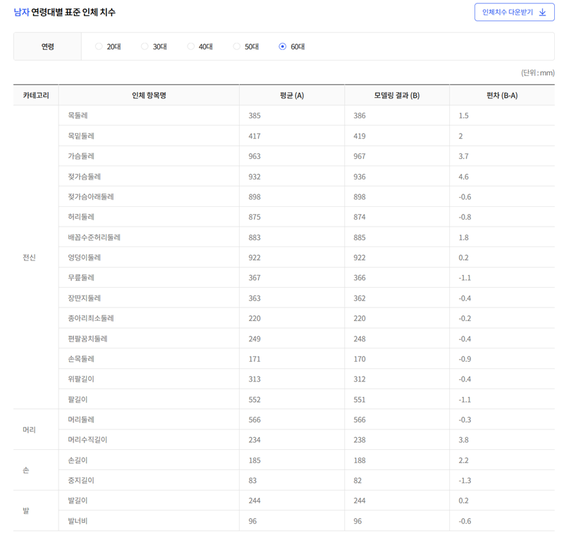 9. 마지막으로 60대를 선택하면 해당 연령대의 남성 평균 신체 치수를 볼 수 있습니다. 전 연령대의 데이터를 비교하며 한국 남성의 표준 체형에 대한 전반적인 정보를 얻을 수 있습니다.