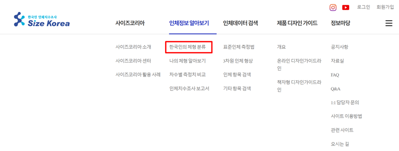 2. '인체정보 알아보기' 아래로 나타나는 여러 소메뉴 중에서 '한국인의 체형 분류'로 이동합니다. 여기서는 성별, 연령별로 구분된 한국인의 평균적인 체형 데이터를 확인할 수 있습니다.
