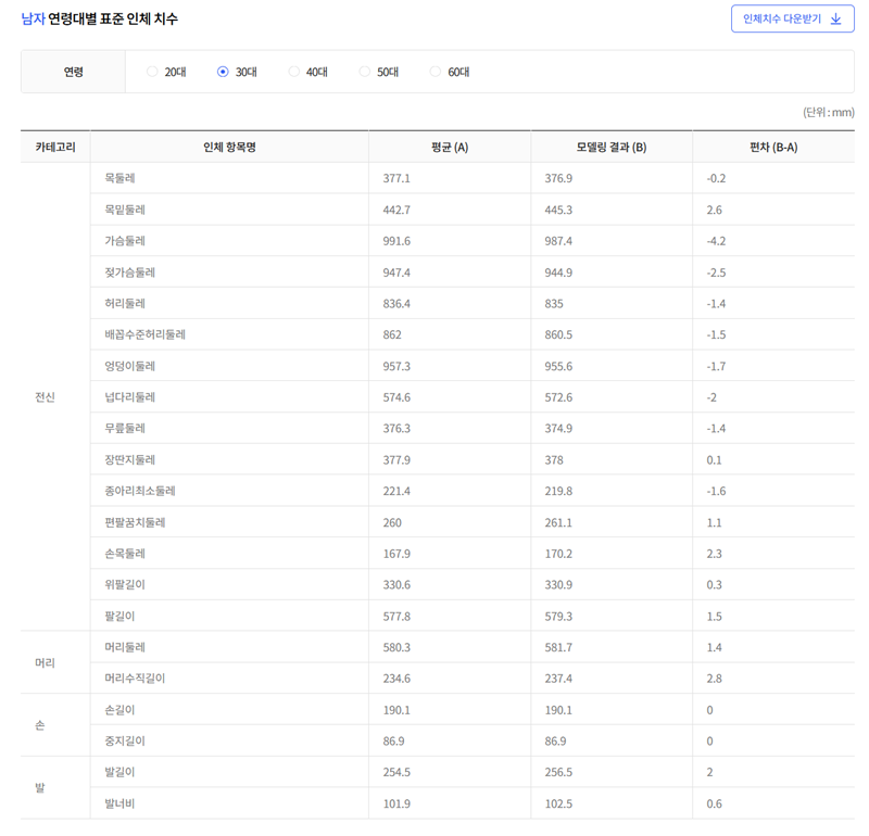 6. 상단의 연령 선택 부분에서 30대를 고르면 해당 연령대의 남성 평균 인체 치수 데이터로 내용이 바뀝니다. 20대와 비교하여 신체 각 부위의 평균값이 어떻게 변화했는지 살펴볼 수 있습니다.