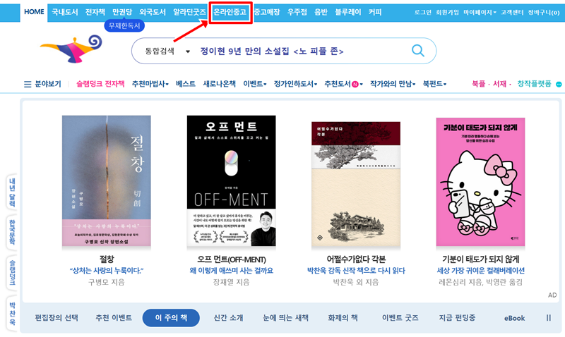 1. 홈페이지 상단 메뉴에서 '온라인중고'를 찾아 들어가세요. 이곳에서 다양한 중고 상품을 확인하고 거래를 시작할 수 있습니다. 중고책뿐만 아니라 음반, DVD 등 여러 가지를 다루고 있으니, 판매하고 싶은 다른 품목이 있다면 함께 살펴보는 것도 좋은 방법이에요.