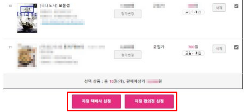5. 팔고 싶은 책들을 모두 장바구니에 담았다면, 이제 배송 방식을 정해야 합니다. '지정 택배사 신청'을 선택하면 기사님이 집으로 방문해서 수거해가고, '지정 편의점 신청'을 이용하면 가까운 편의점에 직접 가서 맡길 수 있으니 편한 방법으로 고르면 돼요.