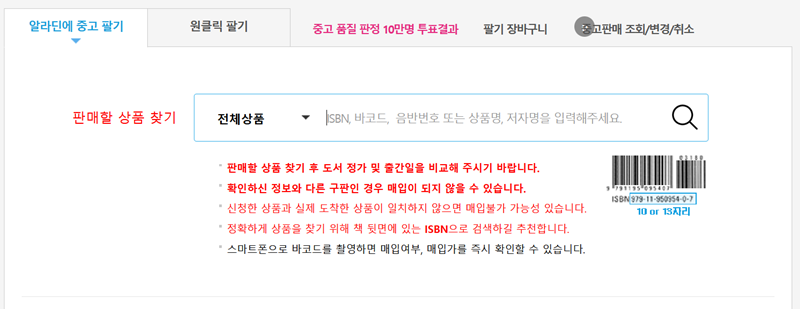 3. 이제 판매하고 싶은 상품을 찾아볼 차례에요. 가지고 있는 책 뒷면의 ISBN 바코드 번호나 정확한 책 제목, 저자명을 입력해서 검색해 보세요. 정확한 정보로 찾아야 내가 가진 책의 매입 가능 여부와 가격을 제대로 확인할 수 있으니, 꼼꼼하게 확인하고 입력하는 것이 좋습니다.