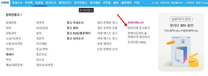 2. '온라인중고' 메뉴로 들어오면 여러 하위 항목들이 보일 거예요. 여기서 '판매자매니저' 아래에 있는 '알라딘에 중고팔기'를 선택해서 진행하면 됩니다. 판매와 관련된 전반적인 관리와 확인이 가능한 곳이니, 앞으로 자주 이용하게 될 메뉴에요.