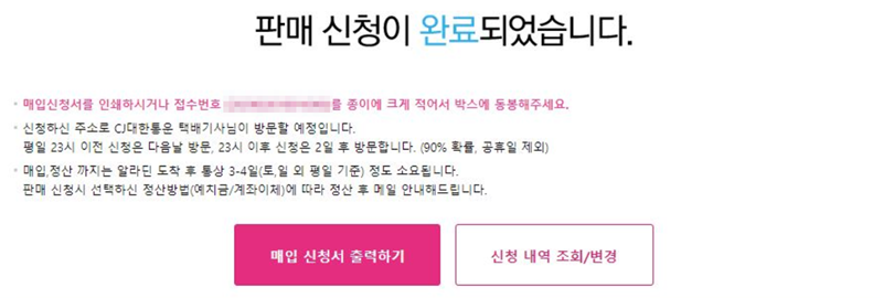 6. 판매 신청이 성공적으로 완료되었다는 화면이 나타납니다. 안내된 접수번호를 종이에 크게 적어 상자에 함께 넣고, 방문할 택배기사님을 기다리면 모든 과정이 끝나요. 정산은 책이 도착하고 검수가 끝난 뒤에 이루어지며, 며칠 정도 소요될 수 있습니다.