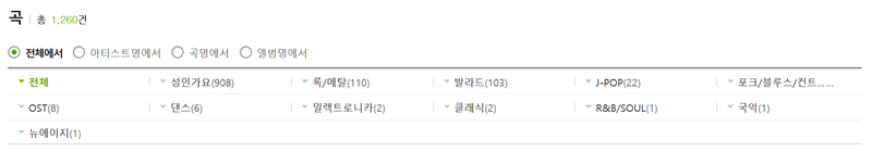 4. 상단 메뉴에서 '곡' 부분을 선택하면 조용필이 발표한 모든 노래를 확인할 수 있는 공간으로 넘어갑니다. 총 몇 곡이 등록되어 있는지 전체 숫자를 보여주며, 성인가요, 록/메탈, 발라드 등 장르별로 나누어 살펴볼 수도 있습니다.