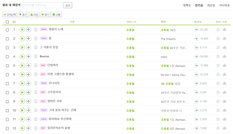5. 노래 목록에서는 '바람의 노래', '꿈', '그 겨울의 찻집' 등 그의 수많은 명곡들이 순서대로 나열되어 있습니다. 각 노래의 제목뿐만 아니라 어느 앨범에 수록되었는지, 그리고 얼마나 많은 사랑을 받았는지 '좋아요' 숫자를 통해 가늠해 볼 수 있습니다.