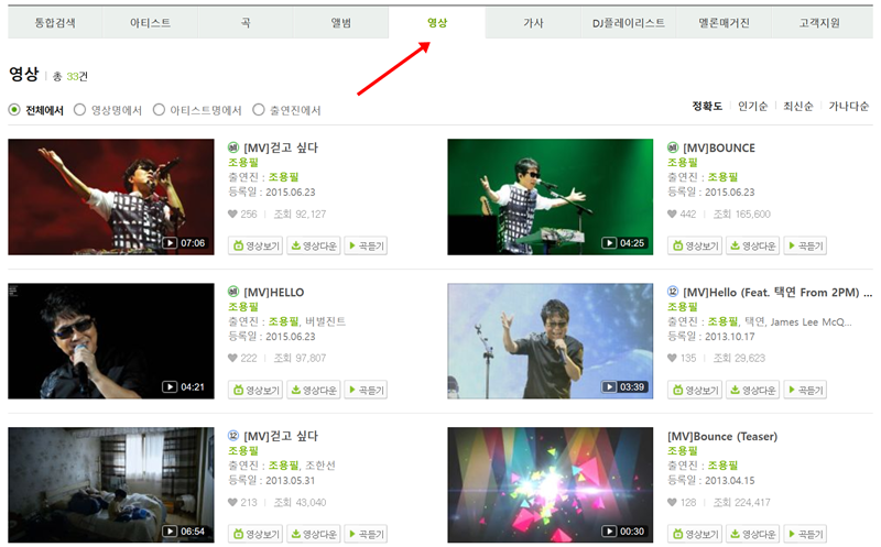 7. '영상' 항목을 살펴보면 그의 음악을 더욱 생생하게 즐길 수 있는 뮤직비디오나 공연 실황 영상들을 모아볼 수 있습니다. '걷고 싶다', 'BOUNCE' 등 대표곡들의 영상이 목록으로 나타나 시각적인 즐거움까지 더해줍니다.