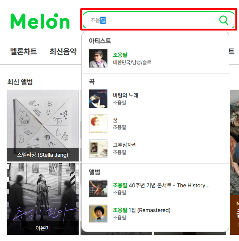 2. 검색창에 가수 '조용필'을 입력하면, 검색 결과가 바로 아래에 나타납니다. 아티스트 정보는 물론이고 '바람의 노래', '꿈'과 같은 대표곡들과 그의 앨범까지 간략한 미리보기 형태로 보여주어 찾고자 하는 정보로 바로 이동할 수 있습니다.