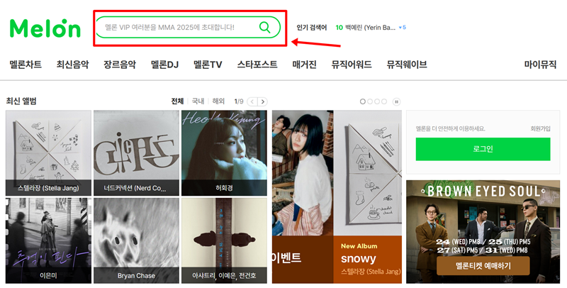 1. 멜론 메인 화면의 상단에 위치한 검색창을 발견할 수 있습니다. 이곳에 원하는 아티스트나 곡의 이름을 입력하여 원하는 정보를 찾아볼 수 있도록 되어 있으며, 현재 진행 중인 이벤트 소식도 함께 나타나네요.