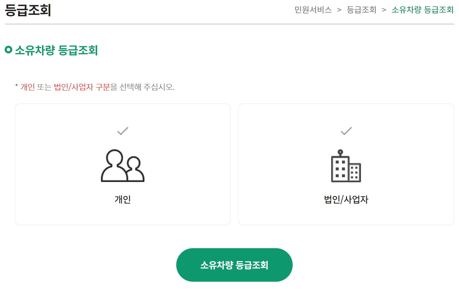 2. 소유차량의 등급 조회를 위해서 개인 및 법인/사업자 구분을 선택 한 뒤 인증을 해야 합니다.