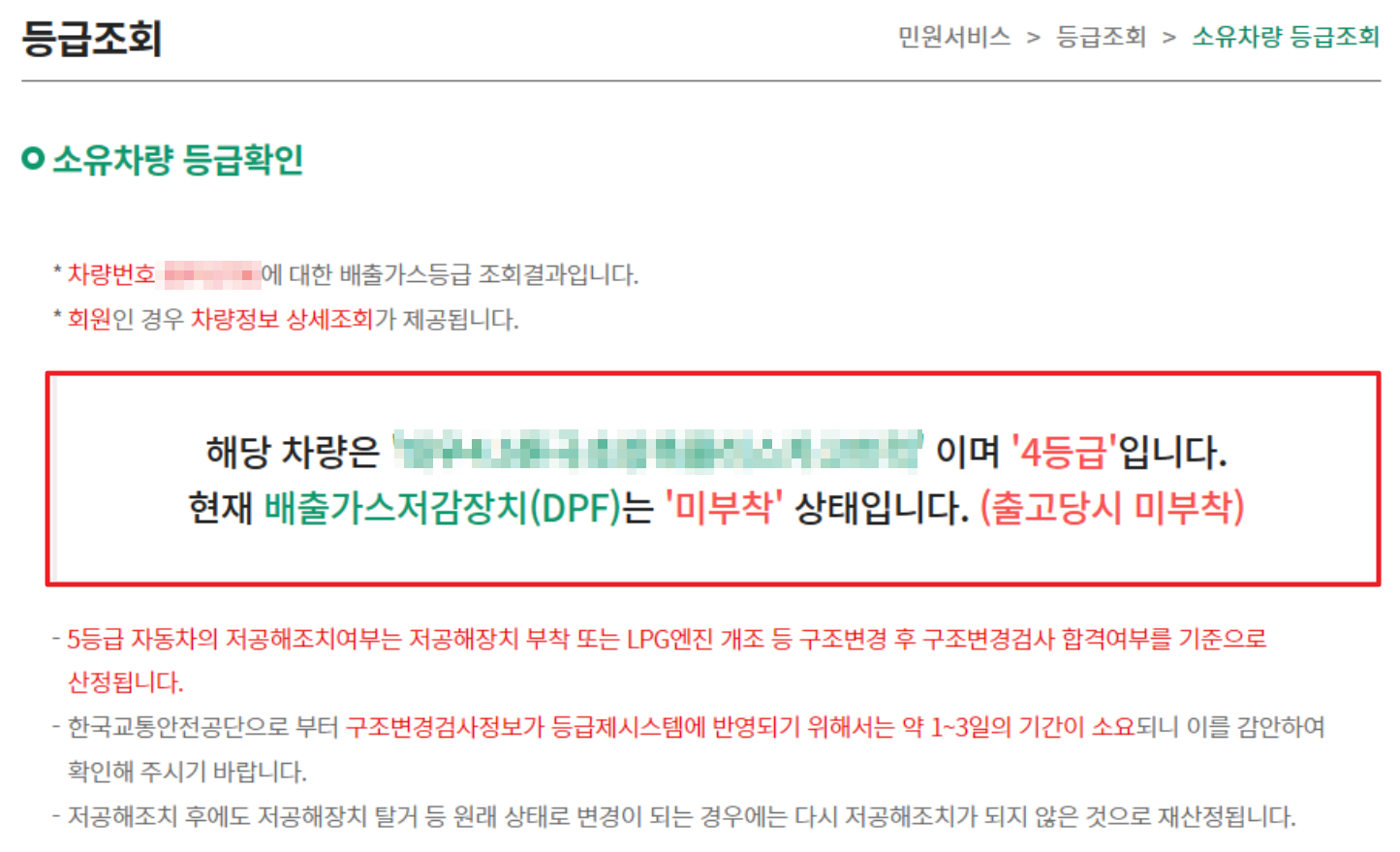 4. 결과가 나오면 등급 및 배출가스 저감장치 부착 여부를 확인 할 수 있으며 5등급 차량은 최대 300만원, 4등급은 최대 800만원 지원을 받을 수 있습니다.