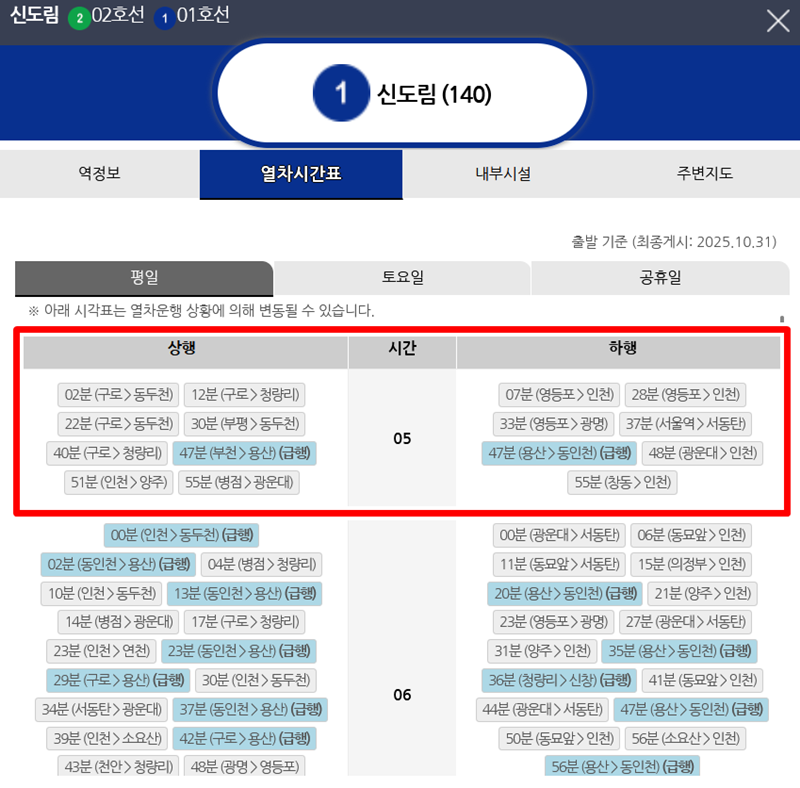 6. 드디어 원하던 역의 시간표 화면에 도착했습니다. 평일, 토요일, 공휴일 별로 나뉘어 있고 상행과 하행 시간 정보가 모두 정리되어 있어요. 가장 위쪽에 있는 시간이 첫차 시간이니, 본인의 일정에 맞춰서 미리 확인하고 여유롭게 하루를 시작하세요.