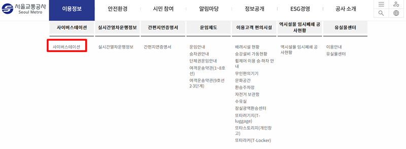 2. '이용정보' 아래에 나타나는 여러 소항목 중에서 '사이버스테이션'을 찾아주세요. 이곳에서는 실제 역에 있는 것처럼 노선도를 보고 역 정보를 파악할 수 있는 편리한 환경을 갖추고 있습니다. 다른 유용한 내용들도 함께 있으니 필요할 때 활용해 보세요.