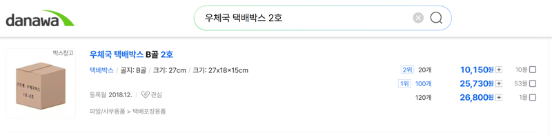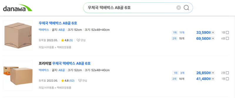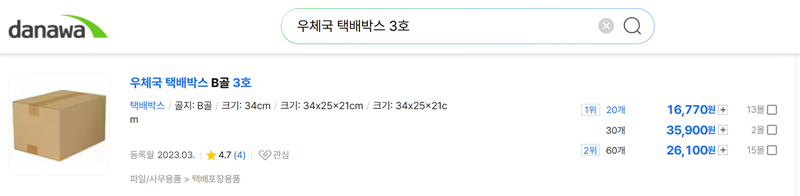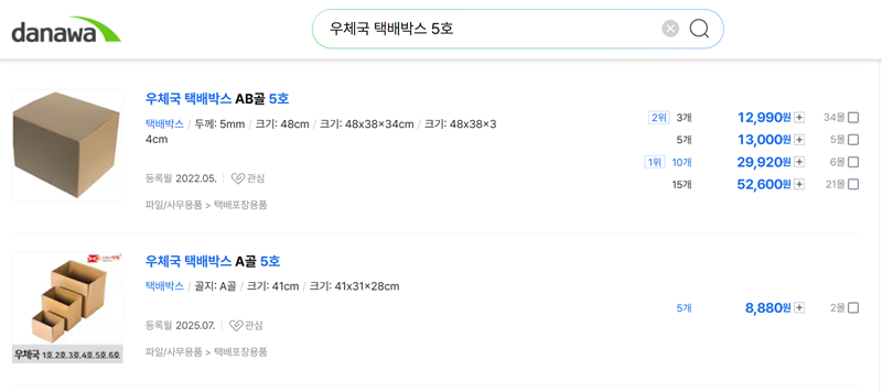 2. 예를 들어 '우체국 택배박스 5호'를 검색하면, 해당 규격의 상자 목록이 나타납니다. 일반적으로 5호 상자는 가로 48cm, 세로 38cm, 높이 34cm 크기로 제작된 것을 확인할 수 있으며, 수량별 가격 정보도 함께 볼 수 있습니다.