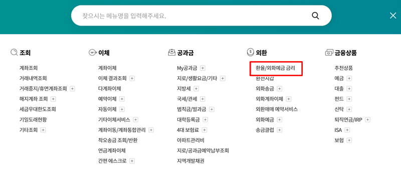 2. 전체 메뉴가 나타나면 여러 항목 중 '외환'을 찾고, 그 아래에 있는 '환율/외화예금 금리'를 선택하여 다음 단계로 넘어갑니다. 이곳에서 환율 조회뿐만 아니라 외화송금, 환전 등 다양한 외환 관련 내용을 확인할 수 있습니다.