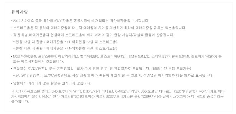 6. 조회 결과 화면 아래쪽에는 관련 유의사항이 안내되어 있습니다. 스프레드 계산 방식이나 고시 환율 적용 기준, 거래가 불가능한 통화 등 알아두면 좋은 정보들이 담겨 있으니 한번쯤 읽어보는 것이 좋습니다.
