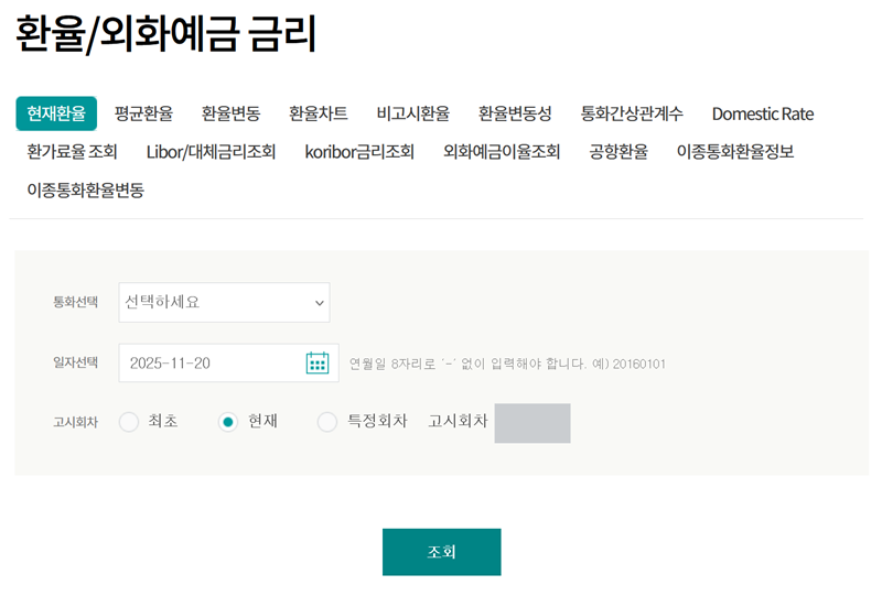 3. 환율 조회 화면으로 이동하면 여러 조회 항목을 볼 수 있습니다. 기준이 되는 날짜를 설정하고 조회 시점을 선택하는 부분이 나타납니다. 날짜는 보통 오늘 날짜로 자동 설정되어 있어 편리하게 이용할 수 있습니다.